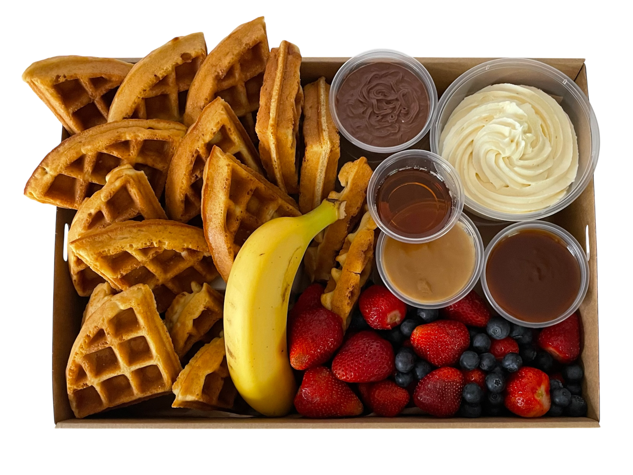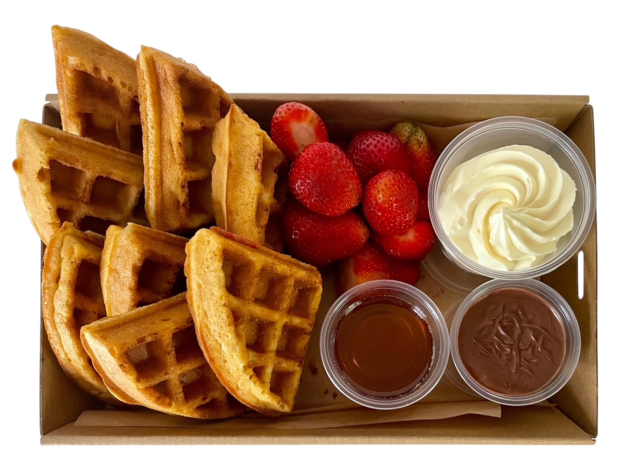 This breakfast box is perfect for two people. It comes with a serving of whipped cream, our homemade chocolate sauce, maple syrup and strawberries. Toppings are available both dairy and dairy free options.